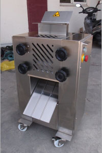 6、確認旋轉方向正確後,把帶筋膜的肉,皮朝下放在刀片上,輕踩腳踏板把肉往前推即可。